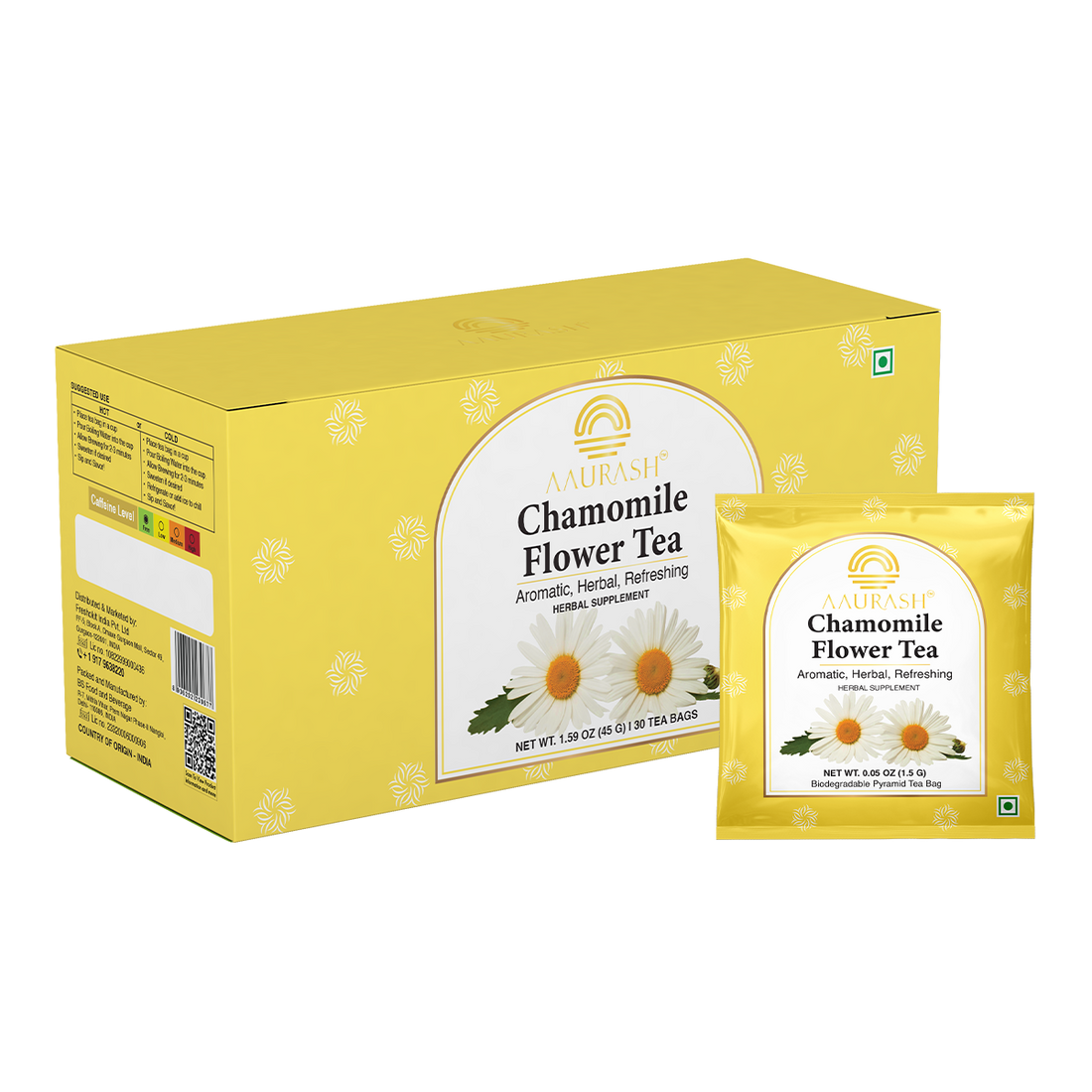 Enjoy a peaceful moment of calm with Aaurash Chamomile Tea, a premium herbal infusion made...