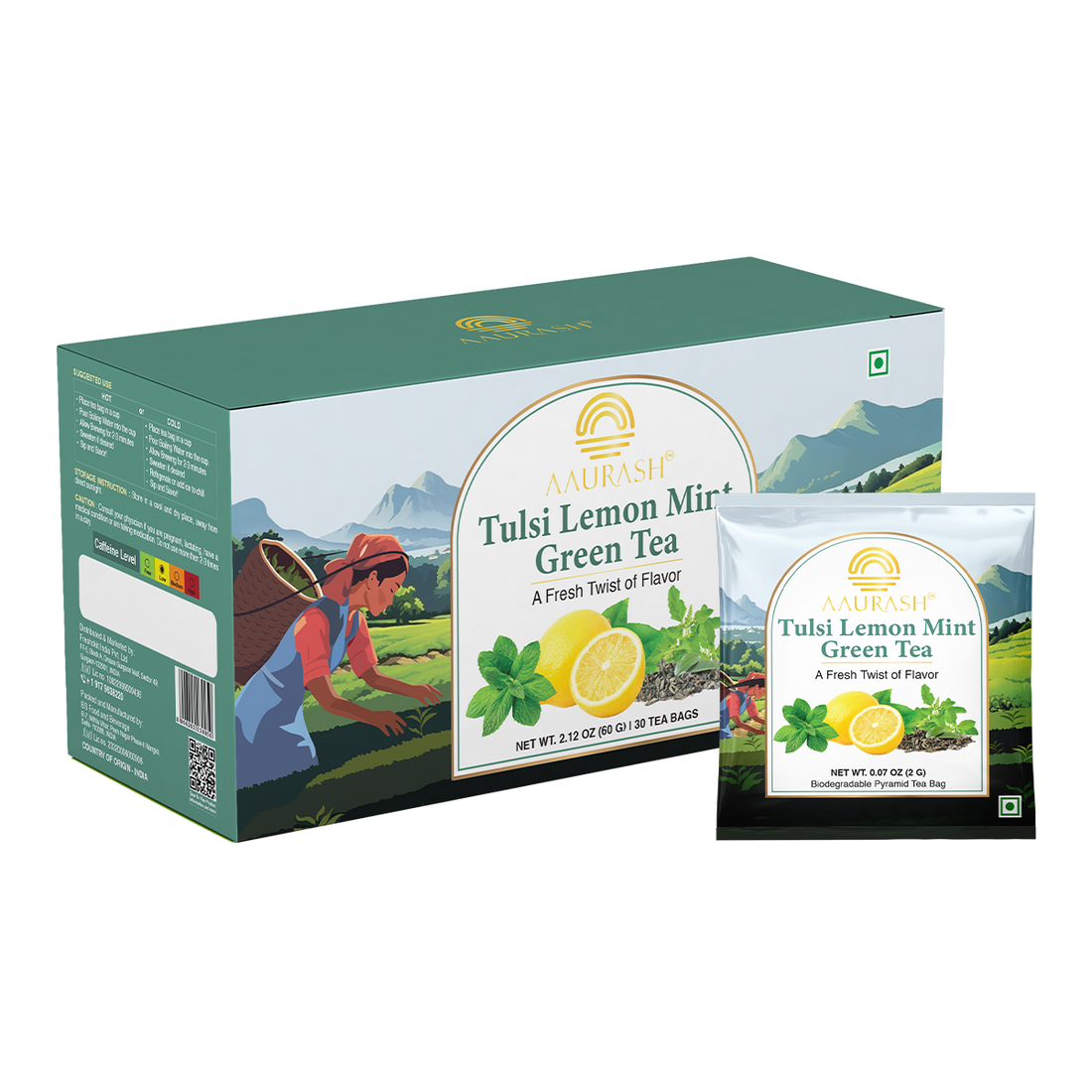Experience the refreshing goodness of Aaurash Tulsi Lemon Mint Green Tea, a wellness ...